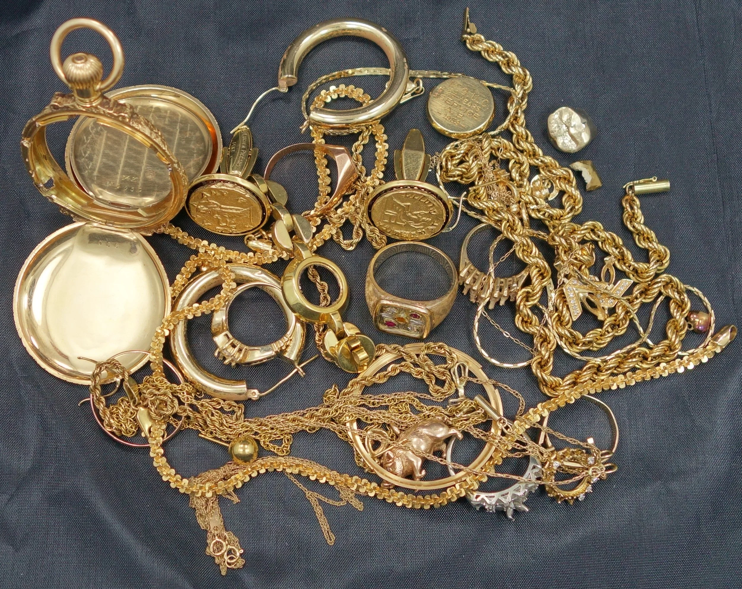Gold Jewelry, gold bracelets, gold rings, gold charms, gold necklaces, gold pendants, gold chains, broken gold, damaged gold, gold class rings, antique vintage gold jewelry, 8k, 9k, 10k, 12k, 14k, 18k, 21k, 22k, 24k, dental gold, white gold, yellow gold, rose gold, gold bullion, gold bars, gold coins, gold watches, kinked gold, wedding bands, gold pocket watches, scrap gold, Canadian Maple Leafs, South African Krugerrands, American Gold Buffalos, gold earrings, rare gold coins, gold eagles, estate jewelry, gold Indians, private mint gold, franklin mint gold, government issue gold, junk gold, gold commemorative coins, gold Rolex watches, gold Breitling watches, gold Cartier watches.